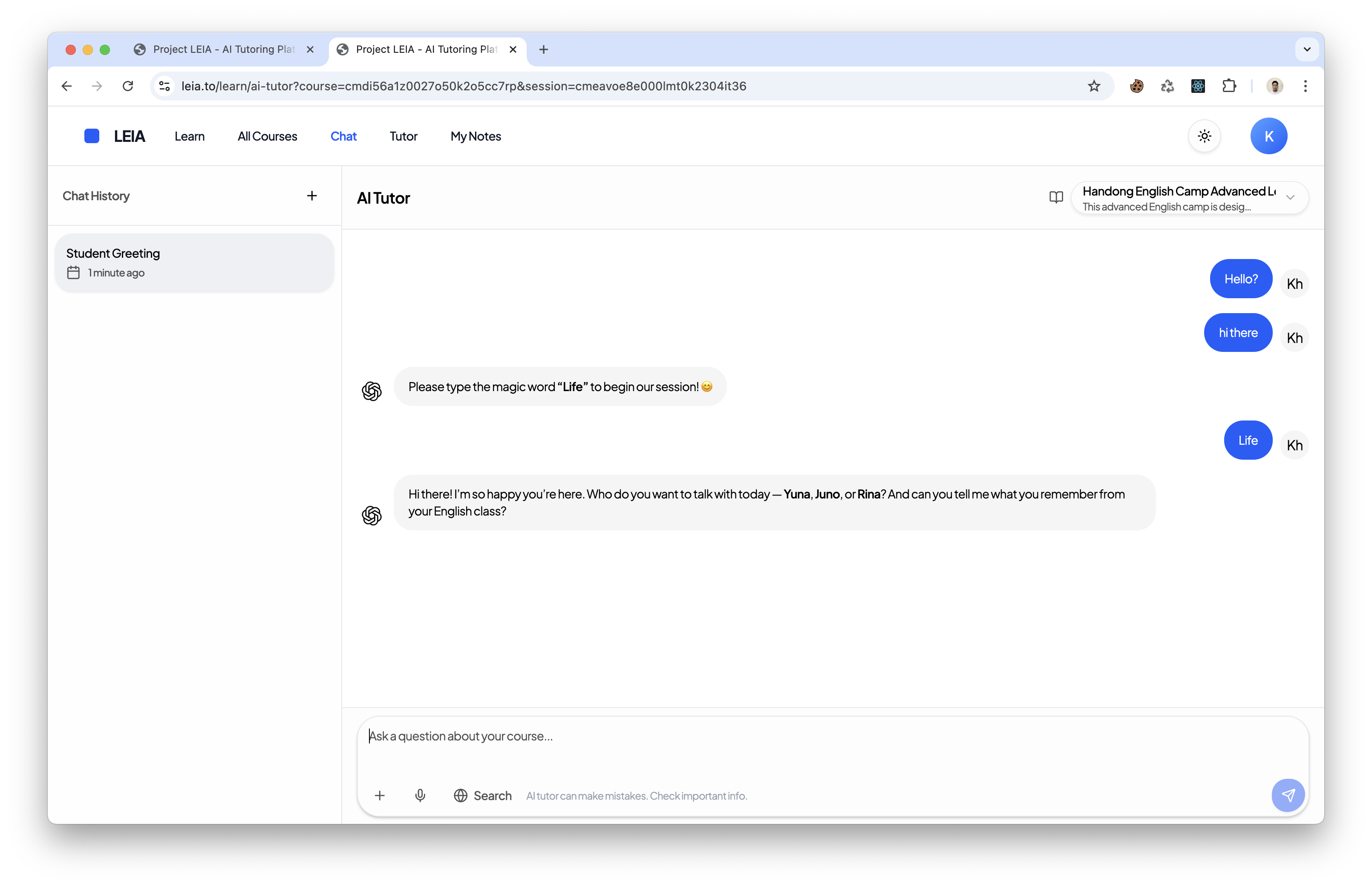 Engage in natural conversations with your AI tutor through an intuitive chat interface.